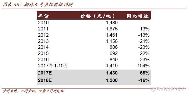随着煤炭产量进一步释放以及先进产能的逐步投放,预计2018年煤炭供应紧张的情况将得到有效缓解,煤价将逐步回归合理区间。中金公司预测2017年秦皇岛动力煤(5500大卡)全年均价640元/吨,较2016年均价上涨34%。供暖季中煤炭需求仍有一定支撑,明年一季度后煤价下行压力将显著增加,预计2018年煤价走势将前高后低,秦皇岛动力煤(5500大卡)均价580元/吨,较2017年下降9%。 焦煤价格面临调整 在钢铁环保高力度及去产能背景下,焦煤需求增长空间有限,随着先进产能逐步投放,焦煤价格将有所回调。9月份焦煤需求环比下降3.4%,焦煤市场供给已经转为小幅过剩9万吨。考虑到当前钢厂焦煤库存低于历史平均,港口库存历史低位,焦煤价格调整幅度可能相对有限。 中金公司预测2017年全年柳林4号焦煤均价1430元/吨,较2016年均价上升~68%,2018年焦煤价格将面临调整:柳林4号焦煤均价1200元/吨,同比下降16%。