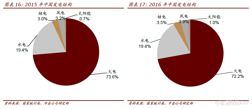 行业整合是“十三五”期间煤炭行业的重要任务。根据《煤炭工业发展“十三五”规划》,十三五期间我国将进一步优化煤炭行业的生产结构并提高集中度,主要任务包括:1)煤矿数量控制在6000处左右,120万吨/年及以上大型煤矿产量占80%以上,30万吨/年及以下小型煤矿产量占10%以下;2)大型煤炭基地产量占比95%以上;3)煤炭企业数量控制在3000家以内,5000万吨级以上大型企业产量占比60%以上。中长期来看,行业集中度的提高有助于加强供给的控制力度,恢复理性供需,同时以市场力量协助产能出清。 根据《煤炭工业发展“十三五”规划》,要推进行业兼并重组,具体内容包括:1)矿区内整合:按照一个矿区原则上由一个主体开发的要求,支持大型企业开发大型煤矿,整合矿区内分散的矿业权,提高资源勘查开发规模化、集约化程度;2)打造大型企业:支持山西、内蒙古、陕西、新疆等重点地区煤矿企业强强联合,组建跨地区、跨行业、跨所有制的特大型煤矿企业集团,推动煤炭生产要素在全国范围内的优化配臵;3)产业链整合:坚持煤电结合、煤运结合、煤化结合,鼓励煤炭、电力、运输、煤化工等产业链上下游企业进行重组或发展大比例交叉持股,打造全产业链竞争优势,更好发挥协同效应,实现互惠互利、风险共担。 主业整合发挥规模优势;产业链整合创造协同效应。我国煤炭行业规模远大于美国,煤炭在我国能源结构中的占比也远高于美国,再加上我国煤炭行业人员及债务负担较重,整合过程需要政策引导与市场机制相结合。从另一个角度来看,正因为我国煤炭及其下游产业链规模都非常大,无论是横向整合带来的规模及成本优势,还是纵向整合(例如煤电、煤运、煤化)带来的协同效应,都具备更广阔的空间以改善效益。 从行业整体的角度来看,整合带动行业集中度提高有助于提高市场对供给的控制能力,增强市场机制的作用,改善供需关系,提高行业盈利与经济效益,而当行业盈利持续改善的过程中也将为行业整合过程中的人员安臵及债务问题创造条件。从个体角度来看,大型煤炭企业可以在煤炭供给侧改革及整合的过程中,以并购扩大业务(煤炭及下游),提高规模效应和发挥协同效应,增强竞争力并穿越周期。 需求:供暖季旺盛,中长期平稳 发电能源构成:煤炭占比仍然超过七成 2016年,火电在中国发电结构中占比72.2%,较2015年下降1.4ppt,水电占比19.4%,与2015年持平,核电/风电/太阳能占比则较2015年分别增加0.5ppt/0.7ppt/0.3ppt至3.5%/3.9%/1.0%。当前,煤炭在发电结构来看占比仍然超过七成。