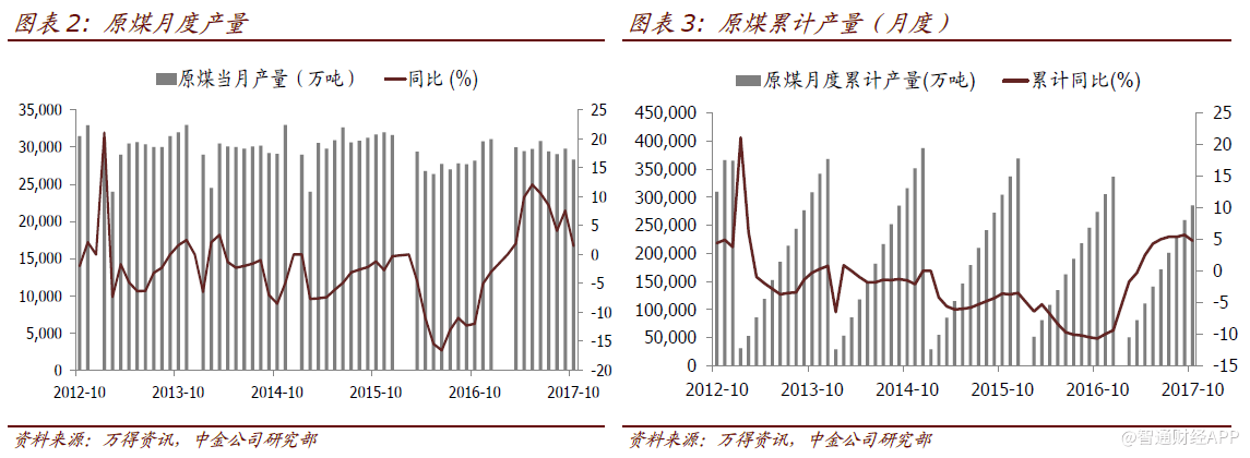 先进产能投放增加供应 煤炭产量仍有增加空间 1-10月全国累计生产原煤28.5亿吨,同比增长4.8%,累计增速与前九个月相比降低0.9ppt。10月份原煤产量约为2.8亿吨,同比增长1.5%,环比下降4.9%,低于2015年10月产量的3.2亿吨以及2011-2015年10月份平均产量的3.1亿吨,供应释放有限,部分受安全环保高力度及假期因素影响。此外,10月份原煤日均产量915万吨,较9月份环比下降~8%。在煤价仍然较高以及保障供应政策的背景下,煤矿产量仍有上升空间。