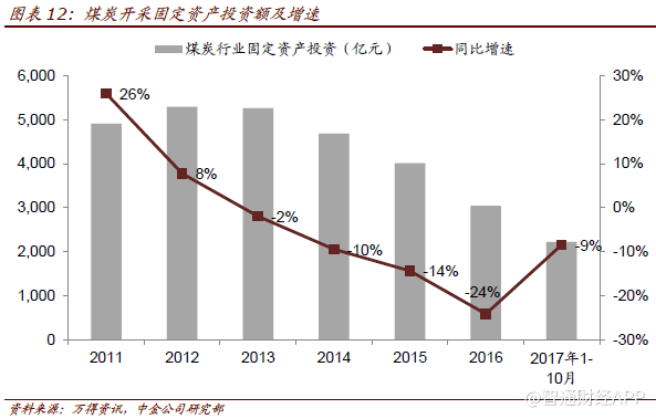煤炭行业FAI增速改善 2011年至2016年,煤炭行业固定资产投资持续下降,累计增速由26%下降至-34%。今年上半年煤炭行业新增产能约为9000万吨,而发改委预计下半年仍有项目陆续投产。今年1-10月份,煤炭行业FAI约为2219亿元,增速由2016年的-24%回升至-9%。向前看,“十三五”期间减量臵换和优化布局增加先进产能目标为5亿吨,而2017年全年预计新增产能为2-3亿吨(不过其中重新核定生产能力的部分可能不能直接带来固定资产投资)。整体上看,中金公司认为煤炭行业固定资产投资大幅下降的可能性不大。