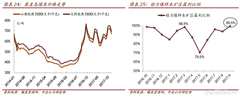 今年年初,煤炭旺季需求强劲而产量释放有限,煤价持续上涨,随后淡季中显著回落,秦皇岛5500大卡动力煤价格5月底较3月底下降~18%。进入夏季需求旺季,产量释放仍然有限,煤炭供应再次出现缺口(7月份动力煤短缺2500万吨),煤价重新开始走高。 今年前十个月,秦皇岛5500大卡动力煤均价为633元/吨,同比上涨46%。近期煤价有所回落,秦皇岛5500大卡动力煤价格较10月中的高位下降8%至671元/吨。 展望2018年,中金公司(16.76, -0.26, -1.53%)对煤炭板块持较为谨慎的观点,总体来看先进产能的投放将是影响煤炭边际供应的关键因素,将逐步缓解煤炭市场供应紧张局面,并促使煤价回归合理区间。短期内供暖季中煤炭需求仍然旺盛,中金公司预计明年一季度后煤价回调压力将显著增加。 中金公司指出,当前A/H煤炭板块P/B分别为1.1x/0.7x,低于历史平均,维持板块覆盖公司盈利预测和目标价不变。