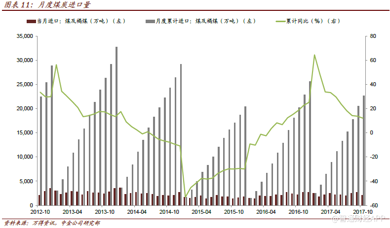 进口煤增长空间有限 进口煤是我国煤炭市场供应的一个重要来源。1-10月份全国煤炭进口约2.3亿吨,同比增长12%。年初以来进口煤累计增速由1月份的64%持续回落至10月份的12%,而10月份煤炭进口2128万吨,同比下降1.4%,环比下降21%。向前看,控制劣质煤进口仍然是重要任务,特别是在环保要求趋严的背景下,整体上看煤炭进口上升空间有限。