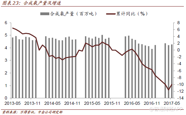 化工:合成氨产量维持负增速 化工方面,合成氨累计产量自去年6月份以来一直维持负增速状态,而今年1~5月,全国合成氨产量约为2122万吨,累计同比下降10%,其中5月份产量约428万吨,同比下降10%,环比增加1.4%。