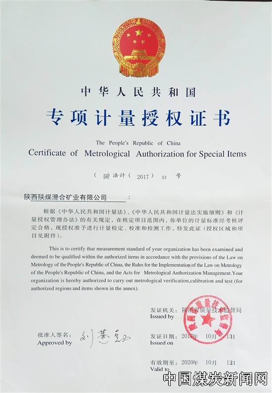 【本网讯】近日,陕煤澄合救护大队仪表站通过考核,获得了由陕西省质量技术监督局换发的《专项计量授权证书》。