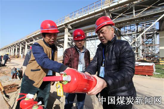 图为检查组认真检查工地现场灭火器材的安全性能。
