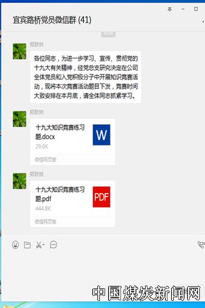 【本网讯】11月8日,川煤鼎能宜宾路桥党总支在公司网络的QQ平台和微信平台上上传了一份十九大知识竞赛练习题,号召全体党员和入党积极份子积极参与学习和答题,拟在本月底开展知识竞赛。