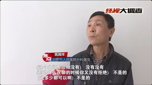 医生竟与药商联合高价卖药,赚取回扣。汨罗市人民医院和汨罗中医医院医生的“指定药店”行为被经视大调查曝光之后,汨罗市卫计局迅速介入,两家医院四名涉事医生被暂停职务,接受纪委调查。 汨罗市人民医院皮肤科医生熊金波,在给病人开完处方后,就有一个习惯性动作。 记者发现,通过熊金波医生办公室就可以直接看到仁丰堂药店,每次他把患者叫至身旁指引的动作自然而娴熟,记者多次拍摄记录到这样一幕。 而汨罗人民医院外科医生姚其祥也存在类似的行为。 医生和药店的这种紧密合作,当然并非简单的为了方便病人。 随后,记者以药商身份找到人民医院和中医院的医生,多位医生承认,他们和药店合作存在药品回扣。 报道播出后,汨罗市卫计局和汨罗市两家医院同时介入调查,记者也再次见到了姚医生。 面对镜头姚其祥医生否认药商回扣的说法,汨罗市食品药品工商质量监督管理局也组织执法人员对医院门口的药店进行了排查,药店方承认,有药商跟皮肤科熊金波医生有联系。 报道播出后,两家医院四名涉事医生被暂停职务接受纪委调查,院方要求各科室自查自纠,也专门组织观看全院医生观看了经视大调查对此事的专题报道,要求所有门诊医生与院方签订不介绍患者到院外买药从中谋利的承诺书。 报道播出当晚,汨罗市人民医院党委会研究决定,立即对熊金波、姚其祥和田年福三位医生进行停职处理,汨罗市中医医院医生舒华也被停职,并要求他们继续配合纪委调查。 记者从汨罗市人民医院获知,实际上,今年以来,院方就与各科室、科室以及医生签订了廉政建设及医风医德责任状,报道的皮肤科熊金波医生在今年11月份就因指定药店开药被患者投诉,院长朱德军还专门找其谈话,他本人也立下保证书,没想到近期又再犯。 在记者暗访中,医生往往以医院药房没有此类药物为由,从而顺理成章推荐病人到外面拿药。对此,院方也否认了此说法。 明明有正常的反映渠道,却借口称无药可用,院外开处方购买药品显然是有利可图,这与国家卫计委“九不准”和“八条禁令”背道而驰。近期,汨罗市卫计局也将在全市范围内开展行业作风整顿。 特约评论员 储闻: 现在为防止医生吃药品回扣啊,很多医院用诸如药占比的考核制度来约束,医生如果将非基础药开多了卫计委会查,奖金泡汤不说,一旦总药费占比过高,严重的纪委同志还会上门来请喝茶。所以有些医生为了这种内部考核能达标,会出现让病患在外面药店买药的情况,但是,请注意但是,那更多是医生为了应对考核的无奈之举,而且一般情况下都只会建议药名,不会赤裸裸的指定药店去损害患者利益。而这几位呢,不敢直接吃药商的回扣,转而与药店勾肩搭背,以为有了这么个中间环节就能掩人耳目,真是应了那句话,聪明反被聪明误啊!我想不仅老百姓看着生气,绝大部分正直的医务工作者也会为这样事情的发生感到憋屈、愤慨。医改是个太大的系统工程,相信社会有足够耐心等待医疗环境大改善的那一天,而当那一天来临前,咱们还得靠党风廉政以及医德医风建设的常抓不懈来保驾护航!