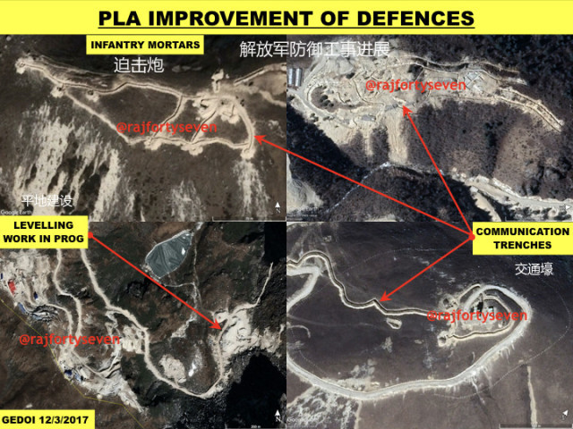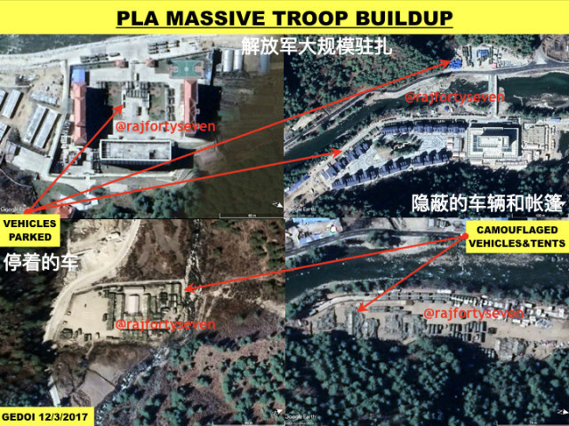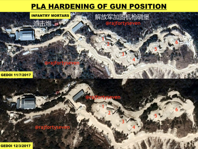 《印度时报》11日爆出消息称,在靠近锡金-不丹-西藏三地交界处的洞朗地区,约有1600至1800名中国士兵已经建立起了事实上的驻扎点。 今日,印度媒体PRINT网站公布了洞朗地区12月3日和10日卫星图像。 报道称自11月底以来,中国在洞朗地区附近不断开展军事设施建设。这些军事设施建在今年8月中印对峙地点直线距离5至10公里,可以容纳5000多人的兵力。 设施包括9座3层房屋、300多辆军用车,还有4座大型接收天线等等。重要地点周围还有铁丝网防护,有些地方甚至还有迫击炮阵地,还有两处山坡被挖掉很大一部分,建成火箭炮阵地。 此外,旧机枪碉堡也进行了加固和升级,还有正在建设中的新碉堡。目前整个阵地上还有很多大型起重机、推土机进行工作,建设工作还在继续。 PRINT网站称,这表明了即使在冬天,中国也做好了随时行动的准备。 基础设施方面 这里现在驻扎了大约一个营的兵力。此前的单层营房如今已被三层楼房取代,地下可能还有隐蔽式的停车场。 信号中心也进行了升级,不仅有地面接收站,四座大型抛物面天线,两座大型卫星天线,实体围墙,连整个平台都稍稍提高了一些,很可能是在为将来的车载雷达做准备。 四周的公路道路都进行了升级改造,到处都能看到起重机、推土机、建筑材料。有一些区域还被铲成了平地,可能要在上面继续建造设施。 军队驻扎方面 河流附近停着许多车辆。在一些区域,能看到一定数量的帐篷和车辆被伪装网覆盖着。三层房屋的周围也有一些车辆,说明这些房屋已经开始使用。 防御工程方面 大部分重要的地点已被铁丝网防护了起来,但有些地方还能看出是迫击炮阵地。还有两处山坡被挖去了很大一块,很可能是要建设成火箭炮阵地。 加固射击碉堡 旧的机枪碉堡也进行了加固和升级,现在转移进入射击掩体或者从射击点离开都非常方便。目前,第二个射击阵地还在修建中。 通过这些卫星图片可以确认,哪怕在寒冬里,解放军依然在火热地修筑工程。而对比11月和12月的卫星图片也能发现,驻扎的解放军也在增加中。