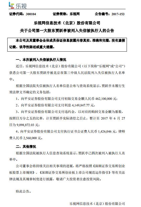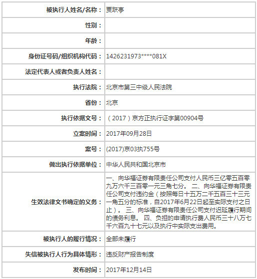 中国执行信息公开网显示,贾跃亭第二次被列为失信被执行人,执行法院为北京市第三中级人民法院,执行依据文号为(2017)京方正执行证字第00904号。 贾跃亭本次被列为“老赖”的案件涉及华福证券。贾跃亭有四条根据生效法律文书确定的义务: 一,向华福证券有限责任公司支付人民币3.05亿元。 二,向华福证券有限责任公司支付违约金(按照每日15.25万的标准,自2017年6月22日起至实际支付之日止)。 三,向华福证券有限责任公司支付迟延履行期间的债务利息。 四,负担的申请执行费人民币38.77万元以及执行中实际支出费用。 13日晚乐视网(15.330, 0.00, 0.00%)发布公告称,公司获悉公司第一大股东贾跃亭被北京市第三中级人民法院列入失信被执行人名单中。 根据全国法院失信被执行人名单信息公布与查询系统显示,贾跃亭未履行生效法律文书确定的义务包括:1、向平安证券股份有限公司支付初始交易金额人民币462,100,000元;2、向平安证券股份有限公司支付利息4,149,847.77元;3、向平安证券股份有限公司支付违约金,以对应的购回交易金额为基数,按照日万分之五的比率,计至贾跃亭实际清偿之日止,暂计至2017年6月27日为9,098,872.03元;4、向平安证券股份有限公司支付执行证书公证费人民币1,426,046元,律师费人民币2,560,000元。 此外,值得注意的是,今年9月份,乐视控股(北京)有限公司和乐视移动智能信息技术(北京)有限公司也曾被列入了失信被执行人名单。其中,乐视控股(北京)有限公司所涉及的案件有两起,案号分别是,(2017)津02执409号和(2017)津02执325号,执行法院均为天津市第二中级人民法院,生效法律文书确定的义务为给付5008.7125万元和5716.4716万元,合计约1.07亿元。 而乐视移动智能信息技术(北京)有限公司所涉及的案号为(2017)津02执325号,生效法律文书确定的义务为给付5716.4716万元,同样,乐视移动也全部未履行,且具体情形为有履行能力而拒不履行生效法律文书确定义务。