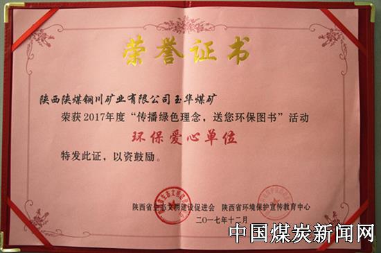 【本网讯】近日,陕煤铜川矿业公司玉华煤矿玉华井喜获陕西省生态文明建设促进会、陕西省环境保护宣传教育中心2017年度“传递绿色理念 送您环保图书”环保爱心单位荣誉称号。