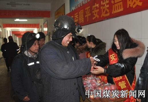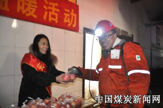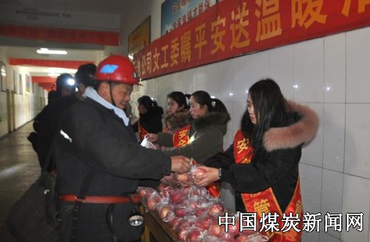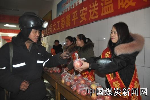 【本网讯】 12月19日中午,正准备乘坐架空乘人装置下井的兖矿集团山西天池公司干部职工,刚刚来到行人斜井连廊内,就被迎面而来的浓郁果香深深吸引。井口职工服务站门外,该公司女工协管员们为即将下井的干部职工送上一袋袋香甜的苹果,以嘱平安送温暖的实际行动,将女性特有的温情,融入到深入学习宣贯十九大精神、助力矿井安全生产当中,表达她们对职工安全生产的期盼和矿井长治久安的祝福。