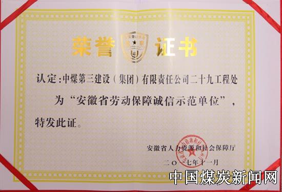| 中煤三建二十九处喜获2017年度“安徽省劳动保障诚信示范单位”殊荣 | |||