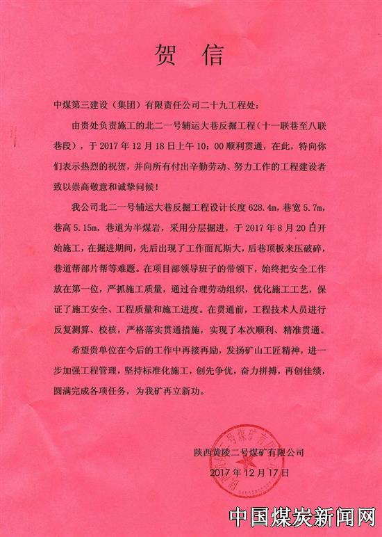 【本网讯】近日,中煤三建二十九工程处收到陕西黄陵二号煤矿有限公司发来的贺信,祝贺该处黄陵项目部施工的北二1#辅运大巷反掘安全精准贯通。