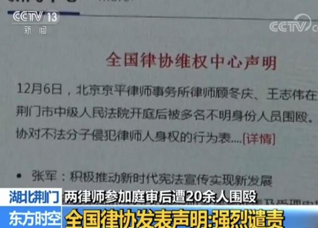 12月6日中午11点多,两名北京律师在湖北荆门市中级法院参加完一起征地案件的庭审后,在回宾馆取行李准备离开时,被20多名不明身份人员围殴,有人甚至叫嚣要“活埋”当事律师。 当时,与顾律师同行的王志伟律师也被多人按倒在地,拳打脚踢。随后经路人报警,附近派出所的警察赶到,当场抓获一人,并扣留了嫌疑人车辆。经医院检查两位律师伤情暂无大碍,现已回到北京。 已有9名犯罪嫌疑人归案 央视记者通过湖北省荆门市公安局东宝分局了解到,该案已经取得了新进展:截至今天下午5点,已有9名涉案犯罪嫌疑人归案。 据了解,12月6日12点,巡逻民警发现 象山大道华侨宾馆门前有多人殴打两名男子,民警立即上前制止,现场抓获一名嫌疑人,扣押涉案车辆一台。荆门市公安局东宝分局初步查明,有12人参与作案,目前已抓获9名犯罪嫌疑人,其中包括4名 组织者和邀约人。目前,案件侦办和追逃工作仍在进行中 全国律协发表声明:强烈谴责 针对此事,昨天中华全国律师协会发表了声明,强烈谴责了这种侵害律师权利的行为。 中华全国律师协会副会长 吕红兵:两位北京的律师在荆门遭受殴打之后,北京律师协会维权中心,立刻和湖北省律师协会做了沟通,由湖北省律协了解情况,同时北京律协维权中心也向中华全国律师协会报告了这样一个事情,全国律协非常重视,7日已经正式发布了一个声明,对此事关注,同时委派我们维权中心工作人员,奔赴现场协助处理相关事件。 同时,全国律师协会按照快速联动机制向公安部法制局做了通报,同时湖北省律师协会也向湖北省公安厅法治制队和荆门公安局做了通报,要求缉拿相关的凶手,绳之以法。据了解,目前相关工作正在有序的推进当中,两位律师情况基本稳定,已经返京,全国律协将对两位权利受到侵害的律师进行安抚工作。 目前,荆门市公安局东宝分局已依法对周某、陈某、邓某、肖某等4名犯罪嫌疑人刑事拘留,案件还在进一步侦办过程中。全国律师协维权中心将密切关注事件进展,依法保障律师合法权益。 此前曾发生“为坏人辩护”律师被殴事件 目前,已有9名涉案犯罪嫌疑人归案,其中4名组织者已被警方刑拘。这起律师被殴事件是否跟代理的案件有关还有待调查。而事实上,律师被打的案件并非个例。今年3月,来自上海的王律师代理的一起案件在北京市某法院公开审理,可让人没有想到的是,休庭后,刚出在法院门口,就被打了。 在一段围观者拍摄的手机视频里,可以看到,在事发时间2017年3月31日,坐在轿车后座上的律师王建军正被周围的人合力拖拽了下来。 被打的王律师是案件中被告人的辩护律师,被告人被控非法吸收公众存款罪,而这些动手打人有一部分就是投资人。当天中午一点左右庭审结束,他和另一位代理律师一起从法庭出来,刚出法院门口就发现周围聚集了很多人。他们其中有激动的人甚至认为“律师不是好东西”。 可是动手的人并不理会王律师的解释。在殴打过程中,王律师的头部和手臂都遭到了击打,后来经过鉴定,已经构成轻微伤。随后赶来的民警调取了法院门口的监控视频,对这一事件进行立案侦查。 律师庭外被打只是“故意伤害罪”? 律师频频被打,难道就没有办法么?我们也梳理了有关法律规定里对执业律师行使权利的保护措施。 《中华人民共和国律师法》中规定,律师在执业活动中的人身权利不受侵犯。 《中华人民共和国刑法修正案(九)》规定:在法庭上,殴打诉讼参与人等行为,属于扰乱法庭秩序。 在《关于依法保障律师执业权利的规定》中也明确,律师因依法执业受到人身伤害,有关机关应当及时制止并依法处理,必要时对律师采取保护措施。 今年4月,司法部会同最高人民法院、最高人民检察院等多部门联合印发《关于建立健全维护律师执业权利快速联动处置机制的通知》,对律师执业权利受侵害的救济渠道和处置机制提出了更加具体的措施。 然而,在现实执法过程中,殴打正在执业活动的律师 真的与普通的伤害案件不同吗?细看可以发现,在刑九中对于律师的保护仅仅局限于在法庭上。那么,对于众多在法庭外被打的律师,如何更有效地维护他们的权益? 律师被打 痛的是中国法治之脸 律师频频被打,虽然打的是律师,痛的却是中国法治之脸,最终受害的更是每一个公民。律师被打,不管打人者是谁,值得我们深思的是,施暴者在关天化日之下,在法院门前,为什么可以堂而皇之地围殴律师?(标2)律师,本是法治社会的产物,是正义天平的一个砝码。没有律师,每一个公民都是受害者。