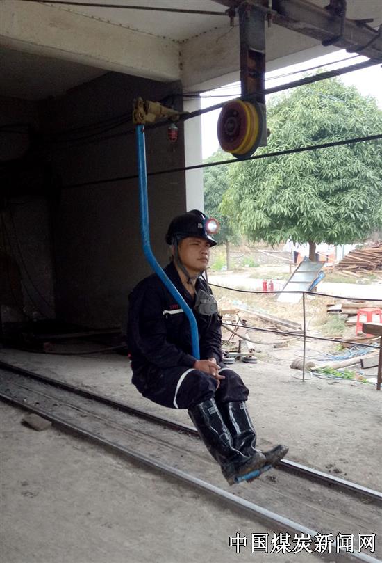 该矿主井新架空人车的使用,既减轻了工人的劳动强度,又提高了工人的工作效率。图为工人乘坐架空人车升井下班的情景。