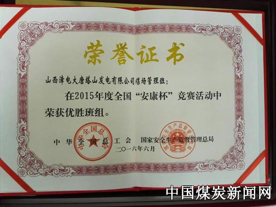 【本网讯】近日,一块姗姗来迟的奖状在同煤漳电塔山发电公司内部引起了轰动。原来是公司煤场管理班被中华全国总工会、国家安全生产监督管理总局联合授予2015年全国“安康杯”竞赛优胜班组荣誉称号,这也是目前塔山发电公司班组建设所获得的最高荣誉。