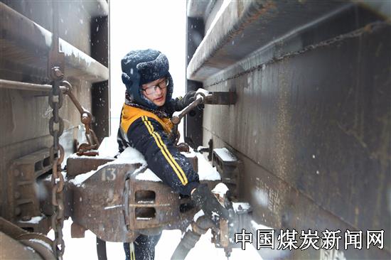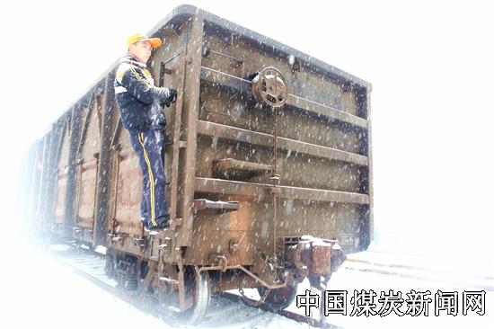 暴雪,也给露天作业的车务段调车员带来较大影响。早上10点,笔者刚走进双龙车站,一台连挂着车皮的机车缓缓而过,调车员们正冒雪组织机车的连挂。今年25岁的调车员畅晨晨和同事已经在雪中工作两个多小时,暴雪已经将他工作服打湿了一大片,他却丝毫不顾,放铁鞋、摘风管、提车钩……他在车辆和股道间艰难走着,他一边用拍着帽子上的积雪一边说:“雪天机车车辆制动力差,调乘人员视线不好,得把神经绷起来”,做好防溜后,畅晨晨迅速跳上机车继续作业,他抓着车梯,把自己“挂”在车辆外,消失在白茫茫的大雪中。