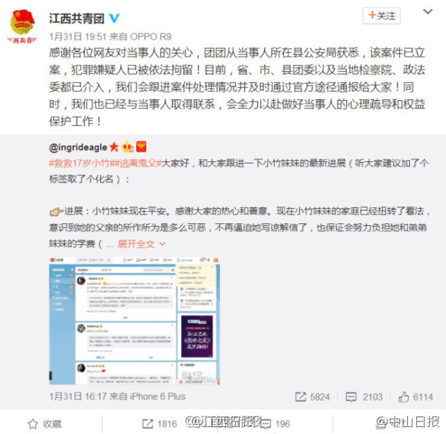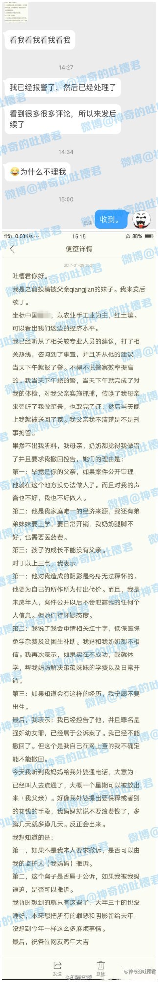 小竹妹妹网贴自曝从13岁开始,就被禽兽父亲强奸,直到17岁。 由于受到父亲的言语威胁,以及考虑到父亲是家里唯一的经济来源,所以一直没报警。 近日,向@神奇的吐槽君 私信求助后,引发关注。 2月3日,@江西共青团 回应:报警后,犯罪嫌疑人已被依法拘留!目前,省、市、县团委以及当地检察院、政法委都已介入。小竹妹妹现在平安,公开透明的捐助通道(小竹妹妹及弟弟妹妹的学费、生活费)还没有开通。未来尽量从政府各部门着手,发挥当地妇联、民政、公检法系统、法律援助的联动作用,为小竹妹妹的未来保驾护航!谢谢! 2月3日官方通报进展 @江西共青团:最新进展情况//@ingrideagle:团委的专项救助基金周三已经确认跟踪帮扶,学费已到位,女孩及当地团委也分别和我持续反馈当地检察院的介入情况(给当事检察官比心),进展良好。请大家理解:我第一要务是避免让舆论高企干扰她,而不是去怼人或者参与怼人出气。 小竹妹妹的“新闻发言人”通报进展 @ingrideagle:年初五招财神,大家新年好!和大家跟进一下小竹妹妹的最新情况#逃离鬼父#: 在@共青团中央 和@江西共青团 的介入下,小竹妹妹已经受到当地共青团、妇联、警察的帮扶保护,目前态势良好。妹妹上午给@神奇的吐槽君 投稿了最新后续,吐槽君被大家感谢的私信淹没了还没看到,我先借花献佛发一下。从1月25日到现在,我们由衷感谢@神奇的吐槽君 为此事的助力! 我在此作为一位热心网友,呼吁媒体工作者及微博大V:不要去挖掘小竹的个人信息(我从未向任何媒体或大V透露她的真实姓名等信息,如果有媒体通过小竹自己知道的也请接下来严格保密)!不要去到处打听!做好她的隐私保护工作,还她和弟弟妹妹一个安静的童年!!!不要造成二次伤害!! 关于捐款:事情到现在我从未开通任何公共捐助通道,没有收过任何人的一分钱(所有微博红包都退回了),欢迎监督查实,警惕打着捐款旗号的骗子。 现在小竹自己表示不再需要捐款,但我会和她长期联系以防万一。关于捐款事宜的某些网友言论,我有一些看法,当然我有自己眼界阅历的局限性,还欢迎大家指正。为免质疑几个店主我都化名了,喜欢美妆首饰的小仙女认出的可以去问问,她们都能证明我还是略有财力的。 当事人讲述事情经过: