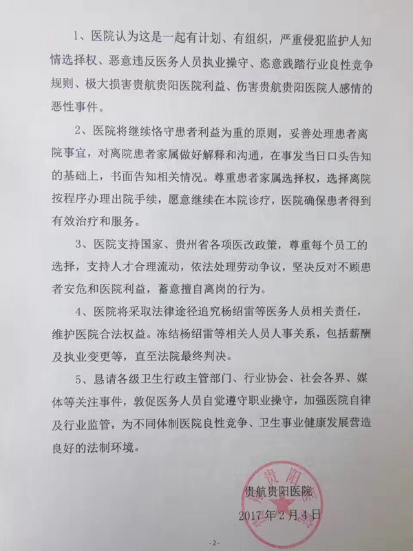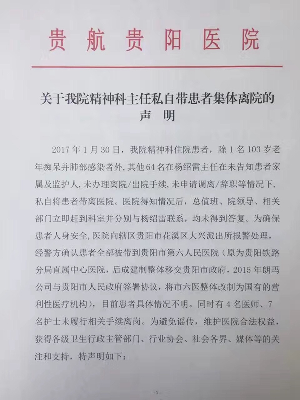 贵航贵阳医院2月4日发出的声明 中青在线贵阳2月4日电:一份贵航贵阳医院关于该院精神科主任杨绍雷私自带64名患者离院的声明在网络中流传,声明落款日期为2017年2月4日。今天下午,贵航贵阳医院品牌策划部负责人肖立放向中国青年报·中青在线记者证实,这份声明确实出自该院,当事医生杨绍雷接受中国青年报·中青在线独家采访时表示,自己和患者确实已经离开贵航贵阳医院。 这份贵航贵阳医院的声明内容显示:2017年1月30日,除1名103岁老年痴呆并肺部感染者外,在贵航贵阳医院精神科住院的其他64名患者被该院精神科主任杨绍雷私自带离医院,杨绍雷并未通知患者家属及监护人,患者也没有办理离院或出院手续,杨绍雷本人也没有申请调离或辞职。 贵航贵阳医院随即向辖区贵阳市花溪区大兴派出所报警。声明中写明:经警方确认,患者全部被带到贵阳市第六人民医院,目前患者情况不明。同时有4名医师和7名护士未履行相关手续离岗。 贵航贵阳医院同时认为,这是一起有计划、有组织,严重侵犯监护人知情选择权、恶意违反医务人员职业操守、恣意践踏行业良性竞争规则、极大损害贵航贵阳医院利益、伤害贵航贵阳医院人感情的恶性事件。