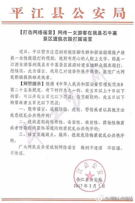 近日,有微信聊天群和微博账户转载一女性被殴打的视频。该视频被配上文字,称是江西一女游客在湖南省岳阳市平江县石牛寨景区旅游时遭当地群众脱衣殴打。经核实,此为谣言,当地警方已对该事件展开调查。 中新网2月7日电据 湖南省公安厅官方微博消息,近日,有微信聊天群和微博账户转载一女性被殴打的视频。该视频被配上文字,称是江西一女游客在湖南省岳阳市平江县石牛寨景区旅游时遭当地群众脱衣殴打。经核实,此为谣言,当地警方已对该事件展开调查。