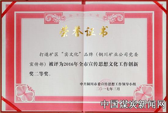【本网讯】 “天下万物,皆成于实。”陕煤集团铜川矿业公司下石节矿始终坚持“文化强企”战略,打造独具特色的“实●文化”品牌,将企业文化与安全、生产、经营、服务完美融合,以文化软实力全面提升企业发展硬实力。在3月9日召开的铜川市宣传思想文化工作会上传来喜讯,下石节矿“实●文化”品牌被市委宣传思想工作领导小组评为2016年全市宣传思想文化工作创新奖二等奖。