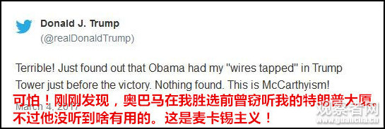 【观察者网综合】自从特朗普顾问因为“通俄”下台以来,美国自由派就处在乘胜追击的狂热中,似乎要把自己的总统塑造成一个国家叛徒。 然而,特朗普今天突然反击了,而且一下就放了个超级大招。 美国当地时间4日一早,特朗普就连发4条推特,指控奥巴马在去年大选之前曾经窃听他所居住的特朗普大厦,并直斥这是“水门事件”、“麦卡锡主义”。 奥巴马的发言人凯文·刘易斯(Kevin Lewis)在回应美媒询问时则表示,特朗普的指控完全是“一派胡言”(simply false)。凯文·刘易斯称“奥巴马政府的一项基本规则是,白宫官员从来没有干涉司法部领导的独立调查,作为这一做法的一部分,奥巴马总统和任何白宫官员都没有命令监视任何美国公民,任何此类暗示都是胡说八道。”此外,白宫尚未对此事件发表评论;而美国联邦调查局与司法部则拒绝对此事件发表评论。 上世纪50年代,美国参议员麦卡锡为代表的美国右翼对不同政见者、尤其是社会主义者进行疯狂的诽谤、迫害。当时在美国工作的中国科学家钱学森就曾遭到美国情报机构窃听。 而美国历史上最著名的窃听事件无疑还是“水门事件”。1972年的美国总统大选中,时任总统尼克松的亲信试图闯入民主党总部安装窃听设备,以获取对手竞选策略,结果当场被捕,导致尼克松成为美国史上首位因为丑闻辞职的总统。 目前特朗普尚未就自己的指控提出具体证据。 而在此之间,民主党方面一直把“窃听”当做自己的武器,指责特朗普为俄罗斯窃听希拉里提供帮助。尽管这样的指责也没有实质性证据,但美国主流媒体似乎早就将此当成事实。 在美国媒体的挖掘下,特朗普国安顾问迈克尔·弗林已经因为与俄罗斯大使联系而辞职,近期司法部长塞申斯乃至特朗普儿子、女婿又被卷入类似传闻。就在今天凌晨,美国媒体的画风还是这样的: CNN:起底特朗普和俄罗斯! 欧洲媒体也一样: 德国杂志封面的特朗普和普京合体 奥巴马似乎也对此深信不疑。他在任时曾对特朗普进行过调查工作,可能会涉及到窃听的技术手段。 备受特朗普信赖的布赖特巴特新闻网昨天就梳理了一些可能的线索。 本周四,一名美国电台主持人马克·列文曾在自己的节目中指责,奥巴马政府在过去的几个月中,曾对特朗普发动“秘密政变”。 列文说,奥巴马在特朗普当选前和当选后都在使用各种手段抹黑特朗普。他将奥巴马政府称为“警察国家”,认为奥巴马而不是特朗普才应当遭到国会调查。 布赖特巴特新闻网于是整理出了奥巴马从2016年6月开始针对特朗普的十大行为,其中包括要求美国海外情报监听法庭 ( Foreign Intelligence Surveillance Court,FISC)调查特朗普跟俄罗斯的通讯联系等。 奥巴马的此类行动得到了纽约时报、华盛顿邮报的证实,但一位参与其中的美国情报人员曾向纽约时报表示,他们并没有找到什么证据。 布赖特巴特新闻网的这篇报道是在特朗普发推前一天发表的,而美国主流媒体此前一直指责特朗普轻信该网站的“假新闻”。 目前尚不知特朗普是真的掌握了奥巴马窃听的证据,还是仅仅受到布赖特巴特新闻网的启发。