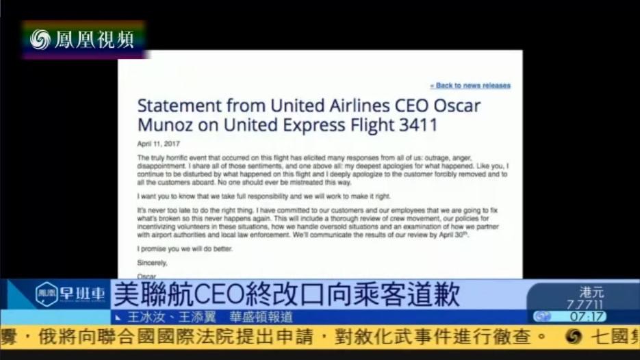 在这次飞行中发生的可怕事件引起了许多回应:愤慨,愤怒,失望。我理解这些情绪,并致以深切的道歉。像你们一样,我对这次飞行发生的事情感到不安,我对被拖拽的客户及其他机上的乘客表示深切的歉意。没有人应该这样被虐待。