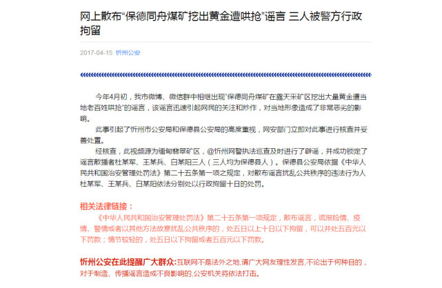 今年4月初,山西省忻州市微博、微信群中相继出现“保德同舟煤矿在露天釆矿区挖出大量黄金遭当地老百姓哄抢”的谣言,该谣言迅速引起网民的关注和炒作,造成恶劣影响。 警方立即对此事进行了核查,经查证,此视频源为缅甸翡翠矿区,并非山西保德同舟煤矿。警方及时进行了辟谣,并成功锁定谣言散播者杜某军、王某兵、白某阳三人(三人均为保德县人)。 依据《中华人民共和国治安管理处罚法》第二十五条第一项之规定,保德县公安局对散布谣言扰乱公共秩序的违法行为的杜某军、王某兵、白某阳依法分别处以了行政拘留十日的处罚。(央视记者 董琪琪)