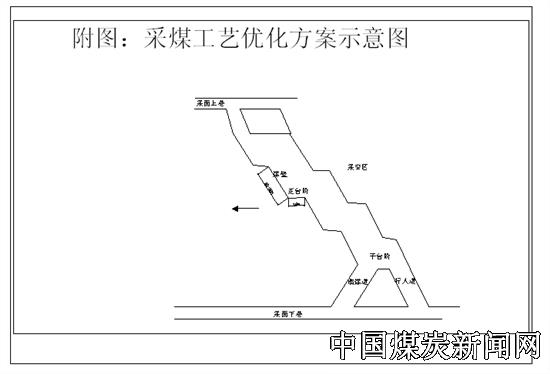 优化方案为采煤工作面由原来的俯伪斜走向分段密集采煤法改为俯伪斜正台阶采煤法,俯伪斜角度调整为40°-45°,采面每隔20-25m设置一个台阶。具体方法将现在采面的俯伪斜角度由30-35°调整为40-45°,这样即保证煤炭能自溜,极大地减少刨煤工作量(刨煤用工由原来的6人减为2人),有效提高日循环推进度;在工作面沿煤壁方向每20-25m留设一个台阶,台阶沿煤层走向方向水平留设,长度为1.2m,这样就能取得有效的防坠管理。
