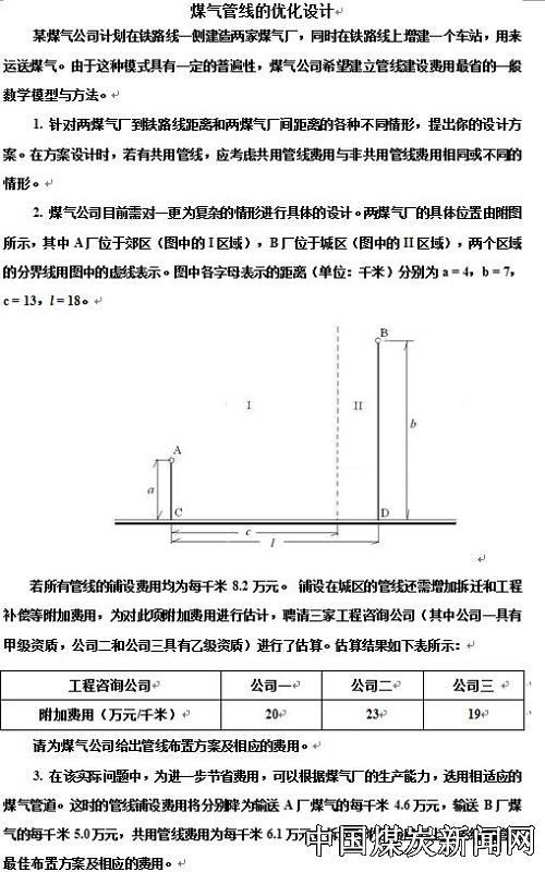 ![]() 本次竞赛设有A、B、C三个题目,分别为“物流中心问题”、“煤气储量的计算”、“煤气管线的优化设计”。每个队伍自行选择一个题目作为本次数模竞赛的目标题目,需要在3天中完成一份包括模型的假设、建立和求解,计算方法的设计,计算机实现结果的分析检验以及模型的改进方法的论文。