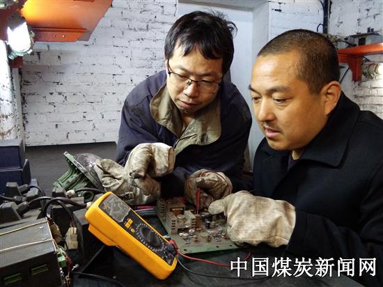 图为班组员工正在一起探讨防爆开关电路板的故障原因。
