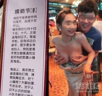 “摸奶节” “摸奶节”是当地彝族传统文化的庆典,每年“鬼节”,就是农历的7月14日、15日与16日这三天。除了烧纸祭奠“好兄弟”之外,来到镇上的男男女女,只要出现就要遵守“摸奶节”的规定,是男人就高兴地摸,是女人就要愉快地接受被摸。