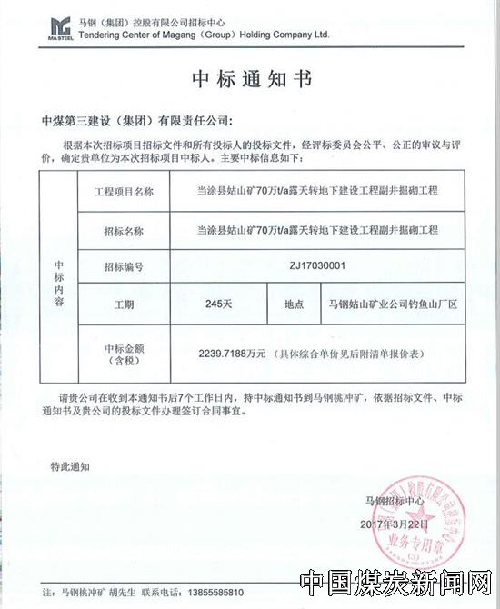 | 中煤七十一处中标当涂姑山矿70万t/a露天转地下建设工程副井掘砌工程 | |||