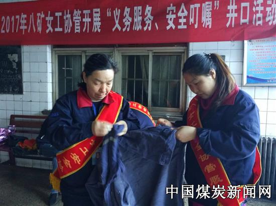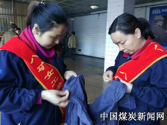 【本网讯】阳春三月,风和日丽。2017年4月7日,河南能源鹤煤八矿工会女工协管会为筑牢安全第二道防线,在该矿井口开展了“义务服务,安全叮嘱”活动,图为该矿机运队女工在为矿工兄弟缝补工装。