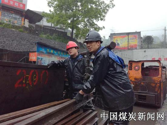 该公司机运队为了能在规定时间内完成公司安排的工作,正常更换+850大巷30kg钢轨,该队队长积极组织电工、钳工组的人员冒着大雨在雨中装运钢轨。
