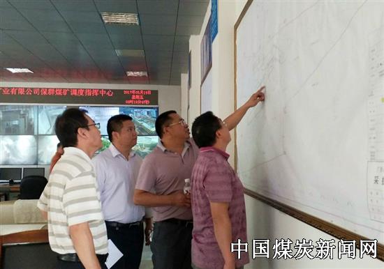 在总结反馈会上,唐卫国总工程师指出,当前公司的安全生产形势严峻,保群煤矿要把安全工作放在首位,要强化责任落实,按期整改各类安全隐患。特别是在矿井采掘设计要优化合理,“一通三防”管理要严抓不懈,有效消除事故隐患,确保矿井安全工作持续稳定。图为唐卫国总工程师(右一)和有关领导检查矿井采掘布置图的情景