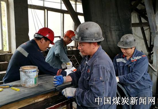 经过综合队职工的共同努力,5月22日,主斜井强力皮带机的100米跑偏段皮带全部更换硫化好,并顺利完成试运转,为下一步复产创造了良好条件。图为工人们在硫化皮带的情景