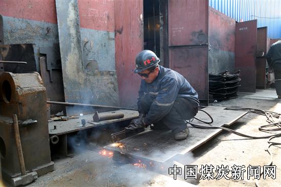 【本网讯】近日,沈煤集团红阳三矿矿建综掘队认真组织检修综掘设备,为掘进生产保驾护航。图为该队职工利用铁板边角余料,自制加工皮带尾护板。