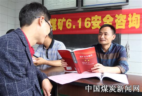 ![]() 逢春煤矿员工现场咨询安全法规。(张启兵 摄)