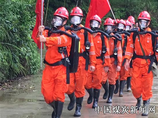 演练场上,48名救护队员身穿橘红色战斗服,头戴红色安全帽,脚蹬黑水靴,佩带红色呼吸器,手拿工具包、救护装备,按照抢险救援指挥部的指令紧密配合,有条不紊的开展“灾区侦察、抢救遇险矿工”任务。