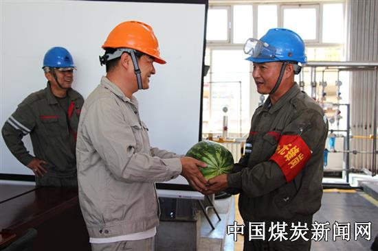 【本网讯】6月20日,为了鼓舞甲醇一套大修员工的士气,神宁煤制油化工安装检修分公司开展了“一线看职工 炎夏送清凉”活动。该公司后勤服务组为奋战在检修一线的员工送去西瓜600余斤,矿泉水20余件,将公司的问候及时传达给现场员工,让工友们在酷暑感受到一丝舒心的凉意。图为该分公司后勤服务组正在检修现场送西瓜。