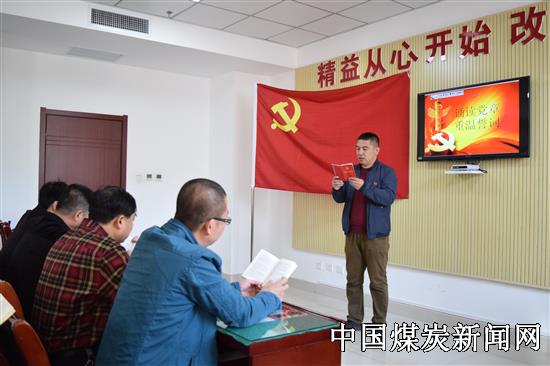 【本网讯】自6月份开始,陕西正通煤业普掘分公司党支部利用党员集中学习时间开展了人人“诵读党章、捧读讲话”活动,引导党员以“回归原点”的心态读原著、学原文,通过朗读加深对党章、讲话的理解、助推“两学一做”学习教育常态化制度化。图为普掘分公司党支部开展人人诵读党章活动。