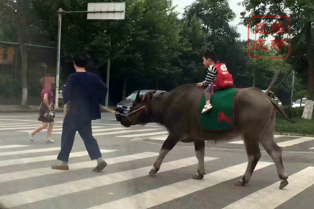 23日下午,成都商报客户端记者见到了骑牛的主人公——李里。原来,从去年冬天孩子上幼儿园开始,只要有空,李里就会牵上牛、驴送孩子上学,途中还会带孩子背诵古诗词经典,“沟通了人与自然、父与子的感情”。