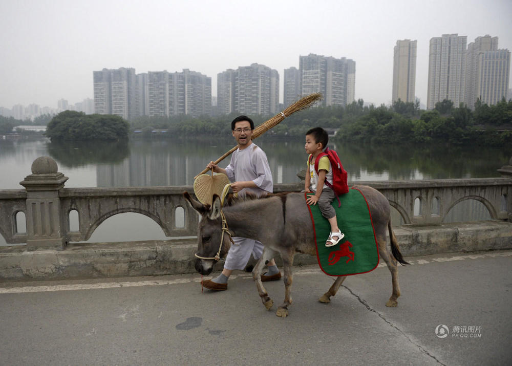 23日傍晚,李里又把毛驴牵到幼儿园门口。“爸爸,今天怎么没牵牛来啊?我喜欢骑牛,牛稳当。”儿子向李里问道。保安把娃娃抱上驴背,路上儿子就念起《三字经》:“人之初,性本善……”过了一会,他又在爸爸的引导下念起陆游的《剑门道中遇微雨》:“衣上征尘杂酒痕,远游无处不消魂。此身合是诗人未?细雨骑驴入剑门。”