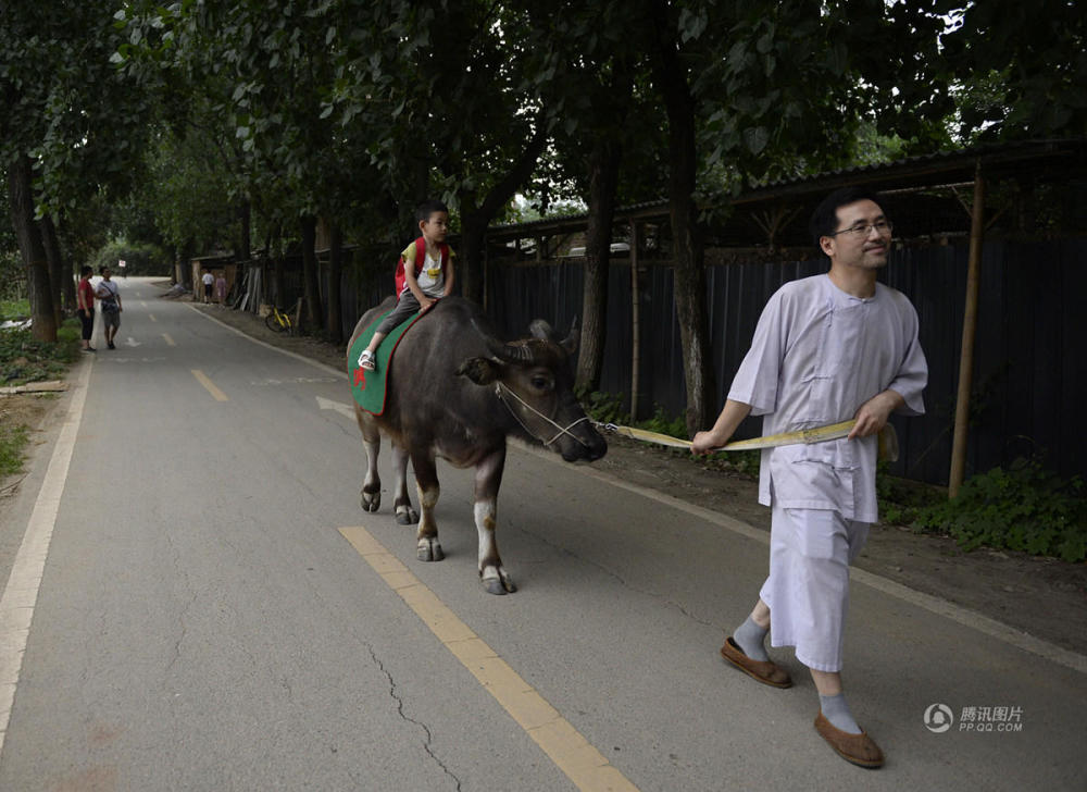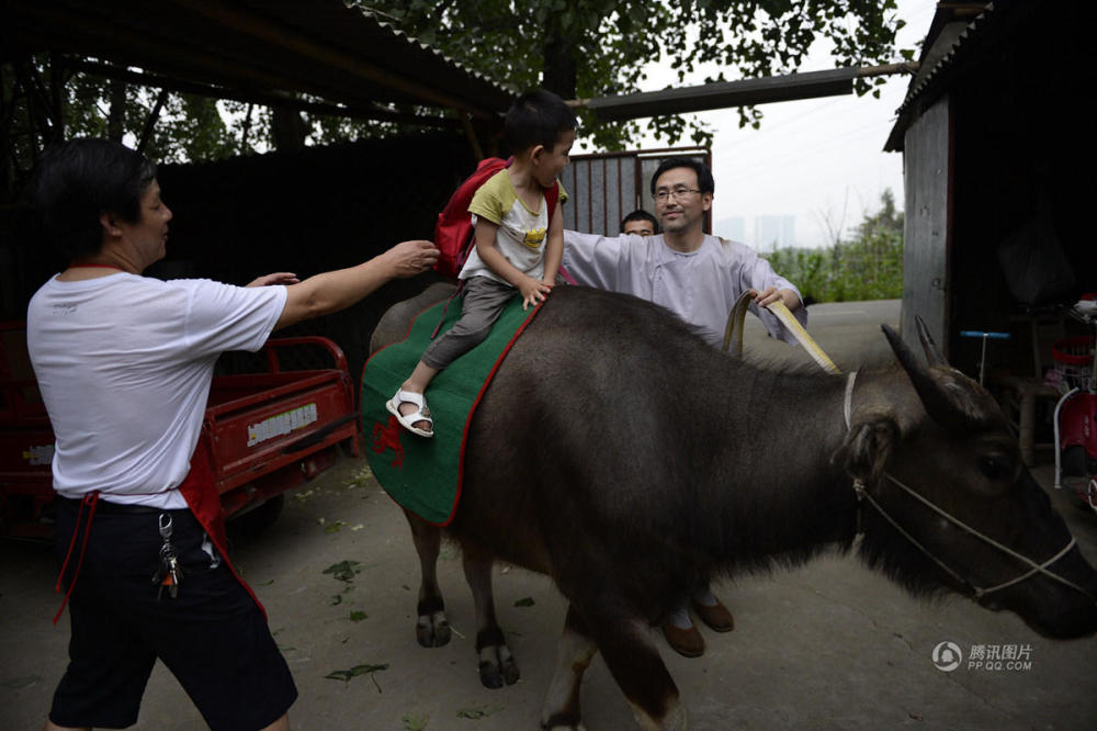 | 父亲醉心国学 带3岁儿子骑牛上学 | |||