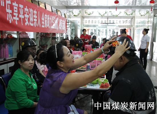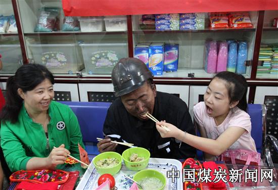 【本网讯】6月23日上午,同煤集团云冈矿工会结合“安全生产月”主题举行“乐享平安迎亲人,全家助力送温暖”慰问活动,邀请二十余名员工家属来到井口服务站,与刚下夜班的井下一线员工全家团聚,共同享用饺子、西瓜等美食,气氛一片温暖祥和。井口服务站女工为他们送上平安符、鞋垫等小礼品,还带来了精心排练的三句半“七大嫂说安全”,在诙谐幽默的唱词中传达了对安全生产、阖家幸福的美好祝愿。