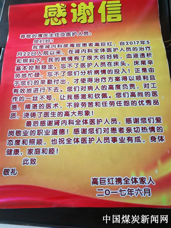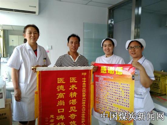 【本网讯】6月19日,冀中能源 峰峰集团总医院北院区肾内科的医护人员收到一面写有“医术精湛见奇效,医德高尚口碑好”的锦旗,一句简洁的话语表达了患者对医务人员精心治疗和护理的赞扬。