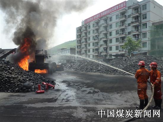 13时30分,调度室电话召请救护队出动救援。接警后,五中队立即组织7名指战员着战斗服携带装备火速赶到现场。指战员一边用干粉灭火器对准火源喷射,一边铺设消防水带用高压水枪灭火。由于铲车的油箱和4个轮胎已经开始燃烧,为保证人员安全,现场指挥员赶紧将人员撤离到安全地点,并安设警戒禁止周围人员接近现场。几分钟后,油箱和轮胎相距发生爆炸,火势依然很大,堆放在铲车附近的煤炭随时有被引燃的可能,燃烧产生的浓烟和一氧化碳等有毒有害气体随着风流进入到井下巷道中,威胁到井下正在作业的人员,情况十分危急。