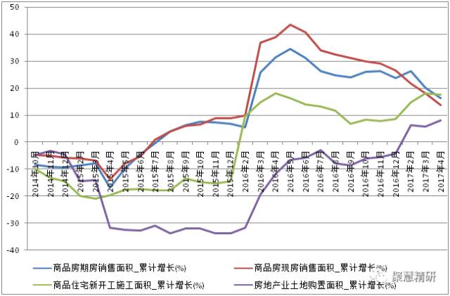 对比上表数据,可以看到2017年1-4月,不论是新开工和竣工的绝对值,还是差额,都高于2014年,其中新开工增幅11.55%,较2016年及2015年更是不在一个规模。因此,这也不难解释为什么与房地产相关的原材料能够出现量价齐升的景象。比如电解铝的产量较上年大幅增长,但价格却并未大幅下滑。 接下来讨论另一个问题:商品住宅新开工面积减竣工面积累计数的增长是否具备可持续性。 未来一段时间竣工面积由过去的历史数据决定,基本上不会因外部因素而大幅波动。而新开工面积则直接取决于销售情况。下图为2014年2017年4月商品房销售面积增速、新开工增速及土地购置面积增速的对比分析,纵轴为增速百分比。