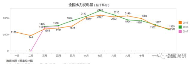 从上面的数据和图示可以看出,2017年水电发电量低于2016年,但高于2015年,与2015年数据接近。因此,假设7、8月水电数据与2015年持平,具体为7月1098亿千万时、8月1046亿千瓦时。